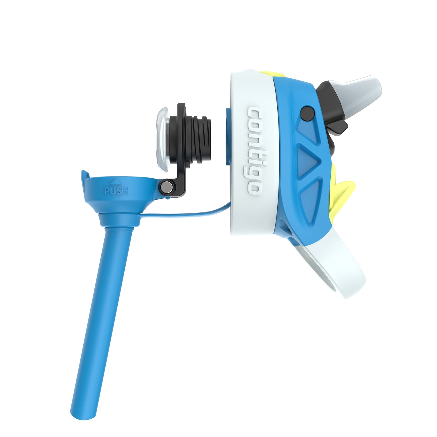 בקבוק שתייה איכותי לילדים מבית CONTIGO, עם עיצוב מתכתי מרהיב בגוון כחול.