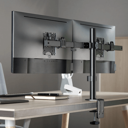 זרוע שולחנית כפולה להרכבת שני מסכים בגודל 17"-32", לחיסכון במקום ועבודה ארגונומית. עם זרועות מתכווננות ולוחית VESA לשחרור מהיר, היא מסייעת בהפחתת עומס בעיניים ושיפור הפרודוקטיביות.