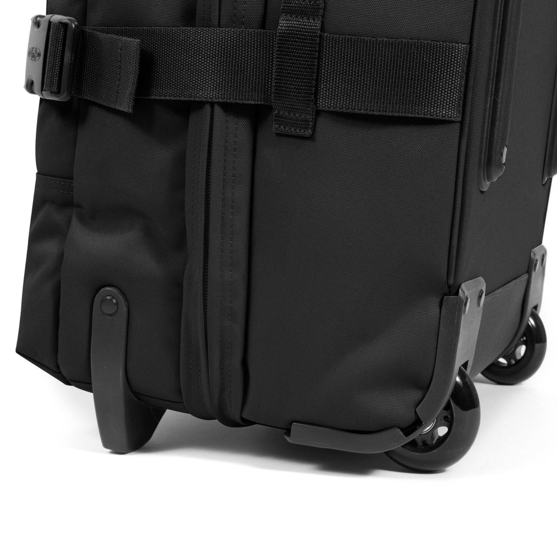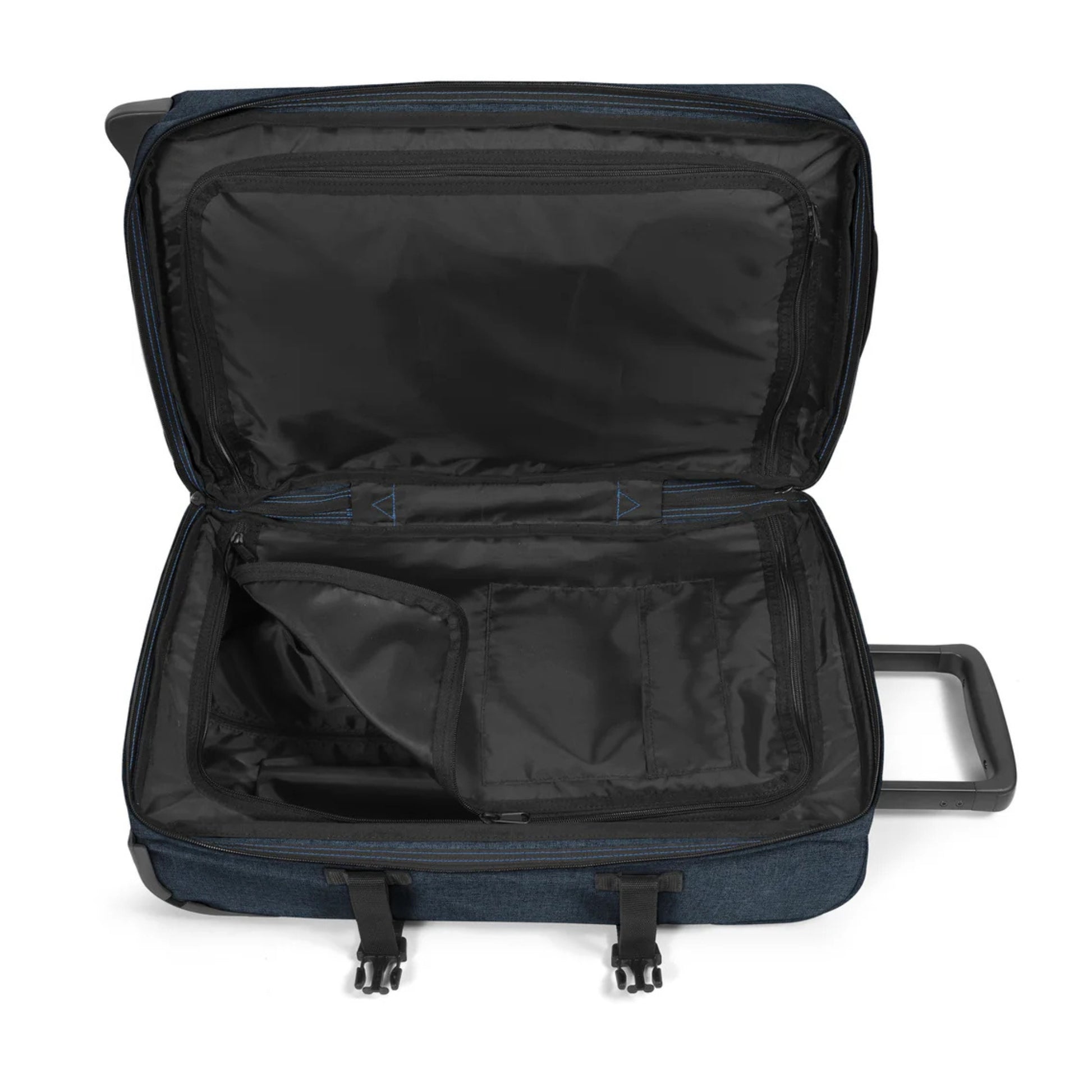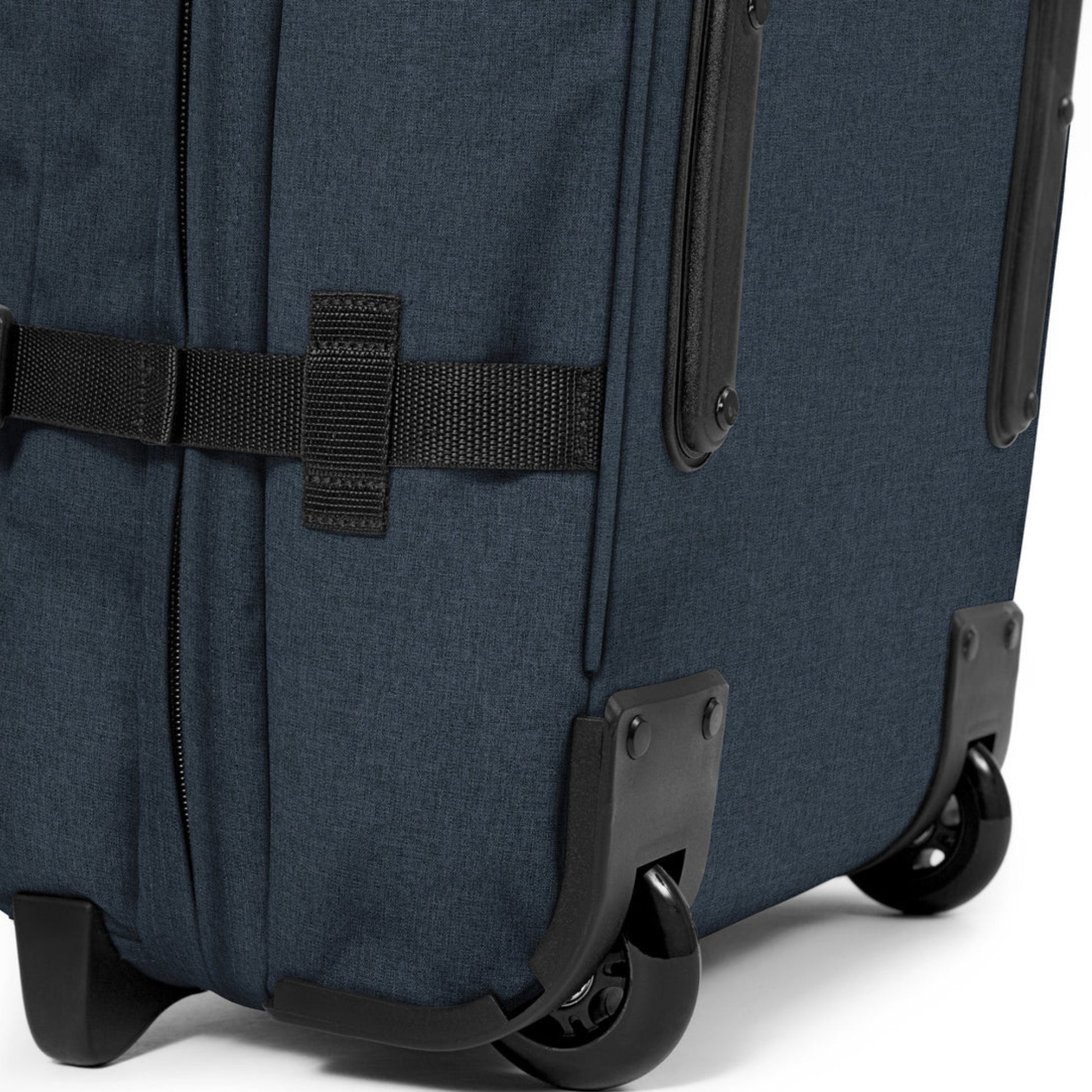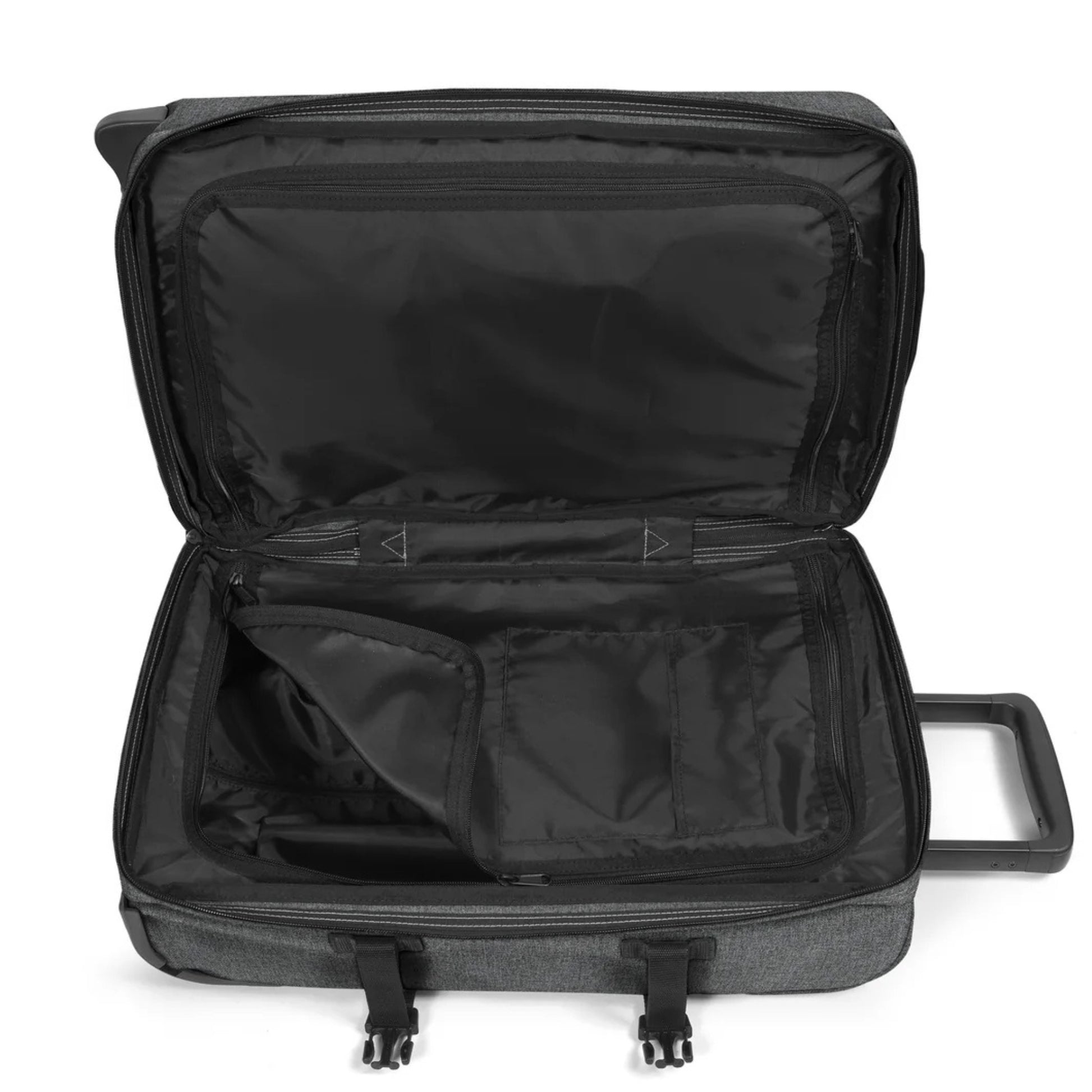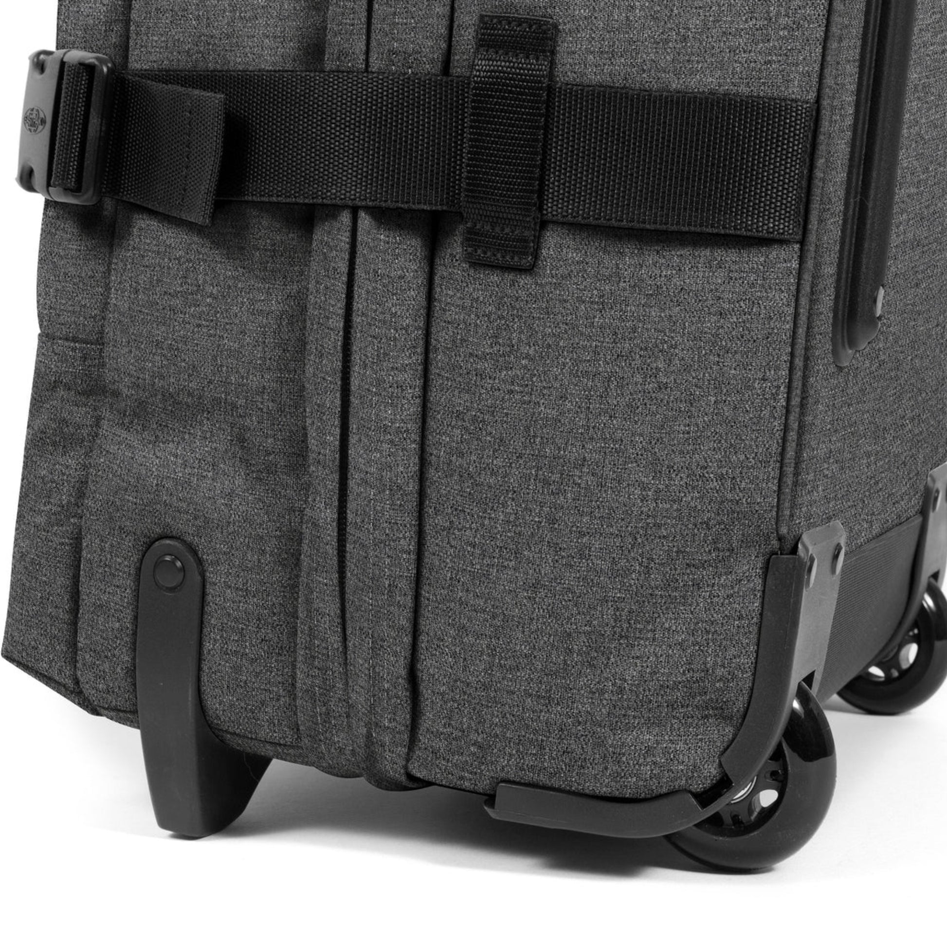 מזוודת Duffle Trolley Tranverz S בגודל תא נוסעים ובצבע ג'ינס שחור מציעה שני תאים עיקריים עם ארגון דו־קומפקטי מרווח ומנעול TSA מובנה לאבטחה מירבית. עשויה 100% פוליאסטר כחומר חיצוני עמיד במים, עם רצועות דחיסה ורצועות בגדים לשמירת הסדר בתכולה. מצוידת במערכת הובלה טלסקופית, שני גלגלים וידית צדדית לנשיאה נוחה ותמרון קל בשדות תעופה וברחובות. משקלה 2.41 ק"ג, ומתאימה כגודל תא נוסעים המאושר ברוב חברות התעופה.