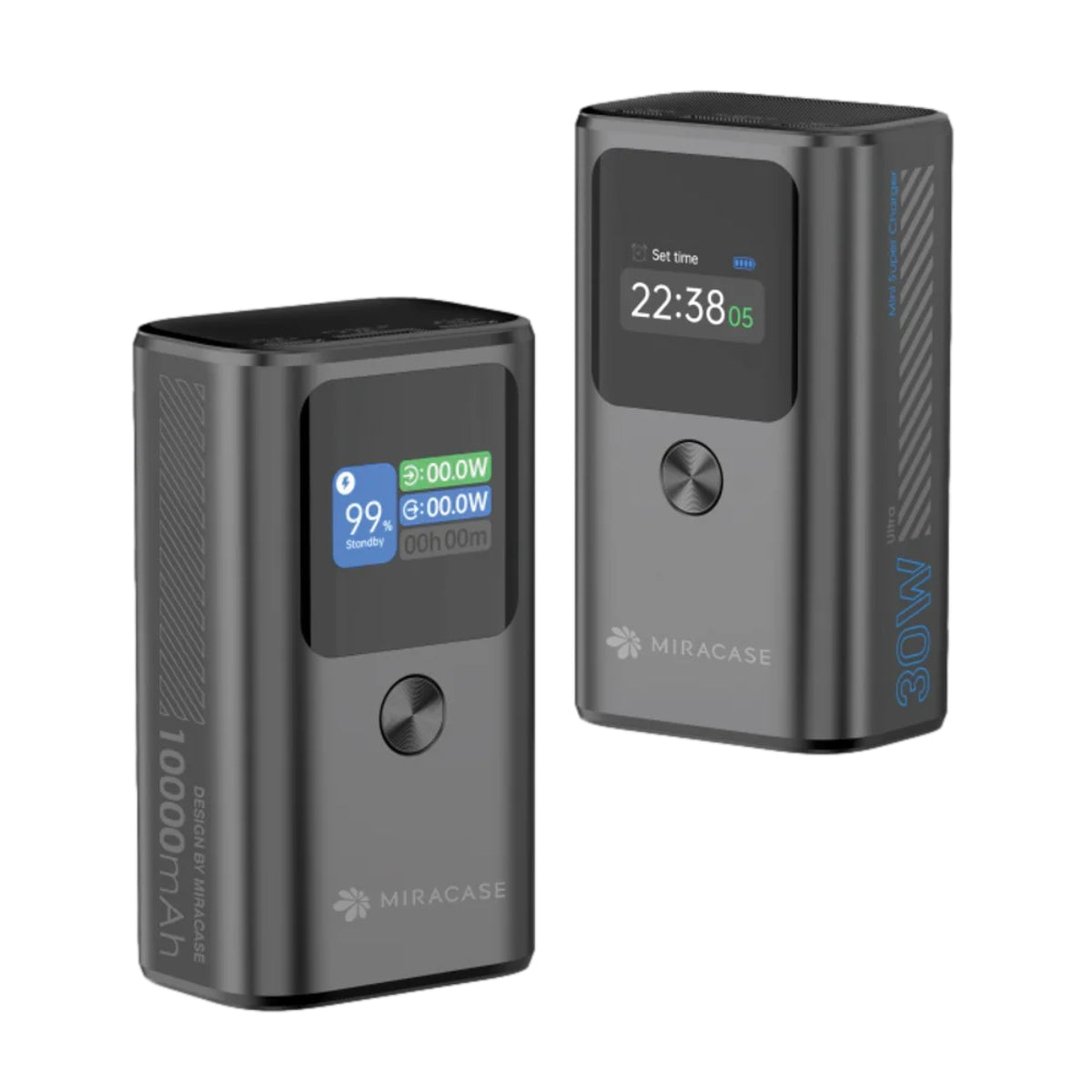 מטען נייד חכם ומתקדם מבית Miracase עם קיבולת בטרייה של 10,000mAh. מצויד במסך צבעוני TFT חכם שמציג במהירות את מצב הטעינה ובעל יכולת פלט PD30W דרך יציאות C1 ו-C2. כולל גם יציאת USB-A עם פלט Huawei 22.5W לטעינה מהירה. העיצוב החדשני כולל שעון, שעון מעורר, טיימר ויכולת לשמש כטרמומטר פנימי. קומפקטי, קל משקל ונוח לנשיאה בכל מקום.