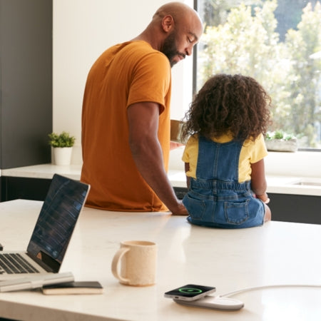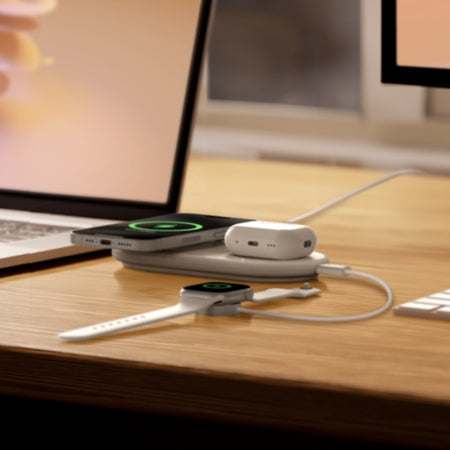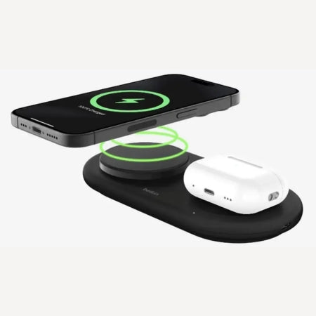 טעינה אלחוטית לשני מכשירים בו-זמנית. קבל עד 15W טעינה מהירה לאייפון שלך על משטח Qi2 ועד 5W טעינה במהירות סטנדרטית עבור AirPods או מכשירים נוספים על משטח Qi.