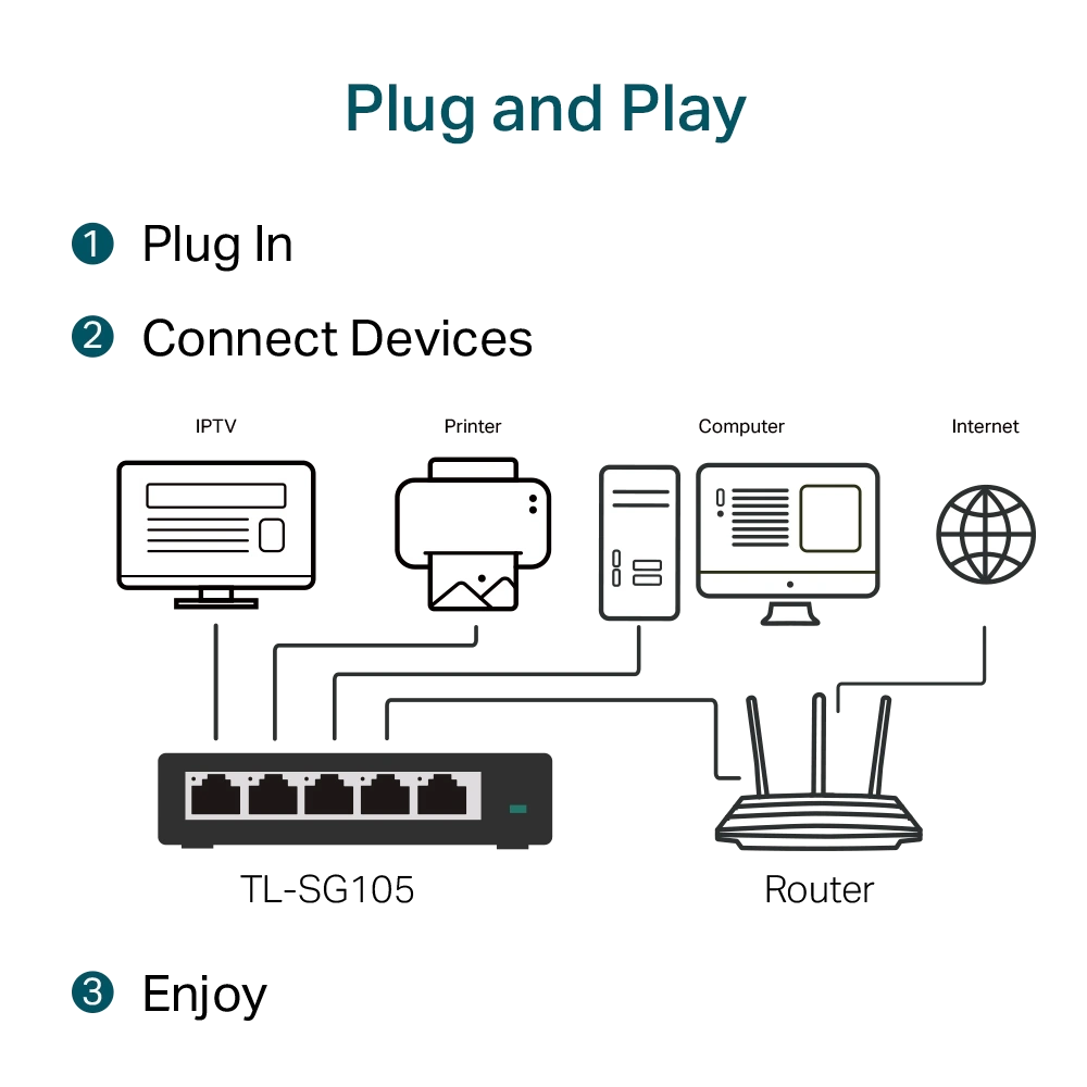 TL-SG105 – מתג שולחני עם 5 יציאות Gigabit בביצועים גבוהים ובעיצוב מתכתי איכותי
