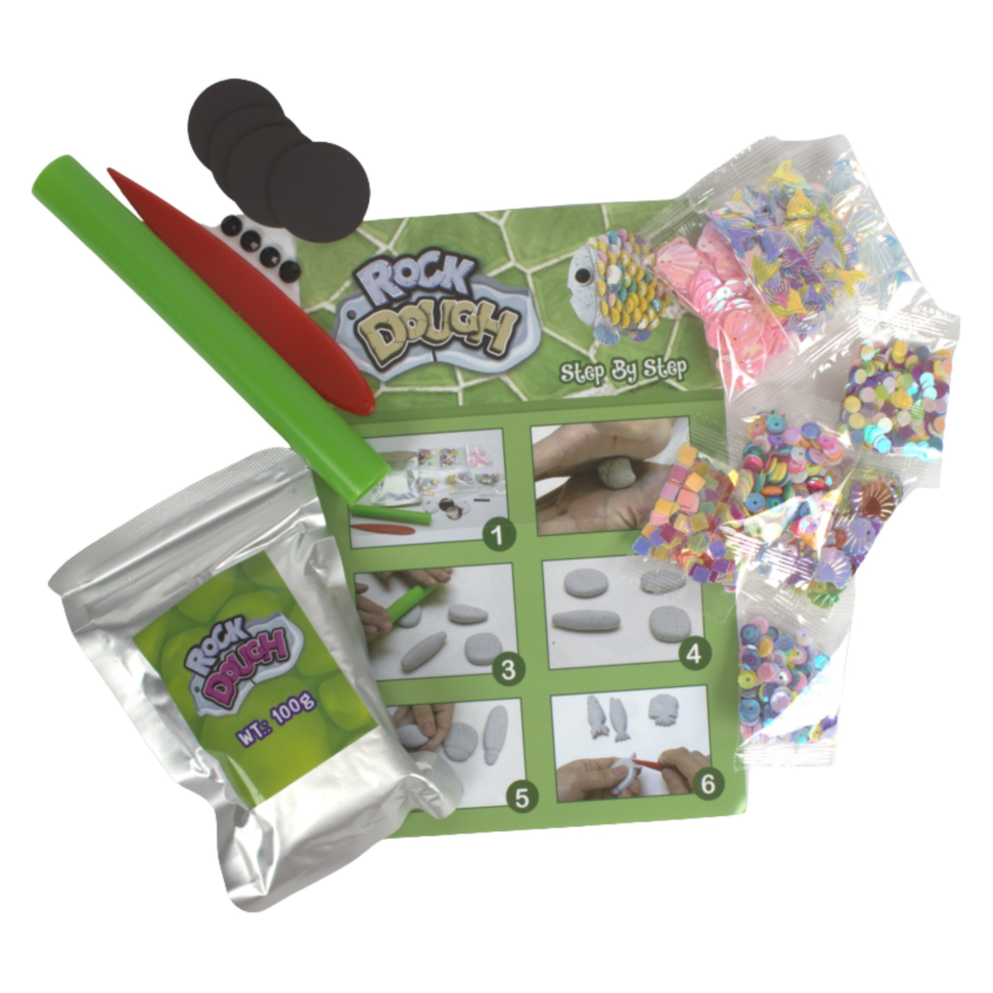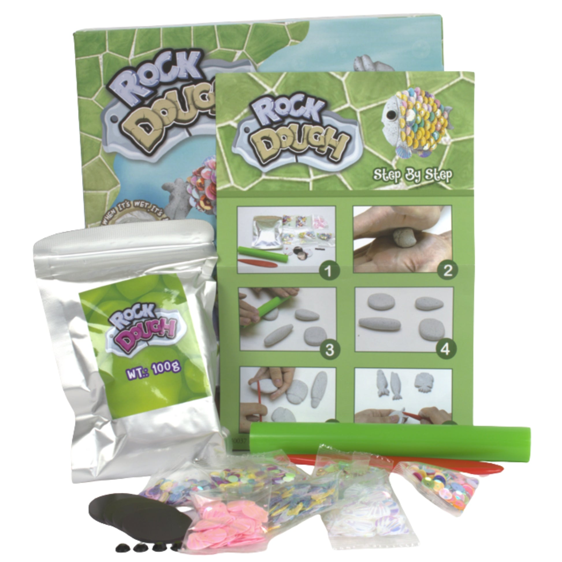 ערכת Rock Dough Glittering Fish היא ערכת יצירה מהנה לילדים הכוללת בצק ייחודי מסוג "Rock Dough", המאפשר לפסל דמויות של דגים ולקשט אותן ביצירתיות. הבצק רך ונעים לעיצוב, אך לאחר הייבוש מתקשה ומקבל מראה של אבן אמיתית, מה שהופך את היצירות לעמידות ומרשימות. הערכה כוללת תבניות ליצירת דגים וחומרים לקישוט כמו נצנצים ופאייטים להוספת קשקשים נוצצים.