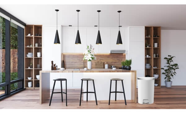 גוף הפח עשוי פלסטיק עמיד בגימור לבן מט אלגנטי, בשילוב מכסה נירוסטה מוברשת שמעניק לו מראה מודרני ויוקרתי – מושלם למטבח, למשרד או לחדר שירות.