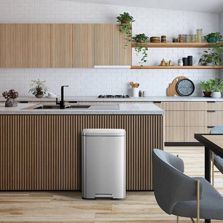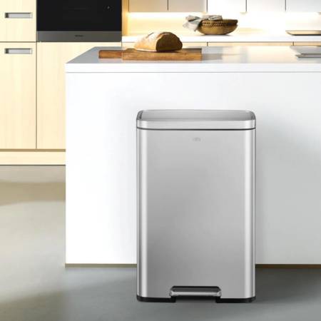 פח אשפה רגלית מדגם EK9361mmt מסדרת Madison בנפח 50 ליטר, בעיצוב מלבני מודרני המתאים לבית או למשרד. עשוי נירוסטה מוברשת וכולל פתיחה באמצעות פדאל לרגל עם מנגנון סגירה שקטה Soft Close, המונע טריקות ורעשים, וגימור עמיד בפני טביעות אצבעות לשמירה על מראה נקי לאורך זמן. מאפשר השארת המכסה פתוח במצב Stay-Open לנוחות בזמן בישול או ניקיון, וכולל מיכל פנימי נשלף להחלפה קלה של שקיות וניקוי נוח. המבנה היציב הופך אותו לפתרון פרקטי ואסתטי למטבח, למשרד ולחללים ביתיים נוספים.