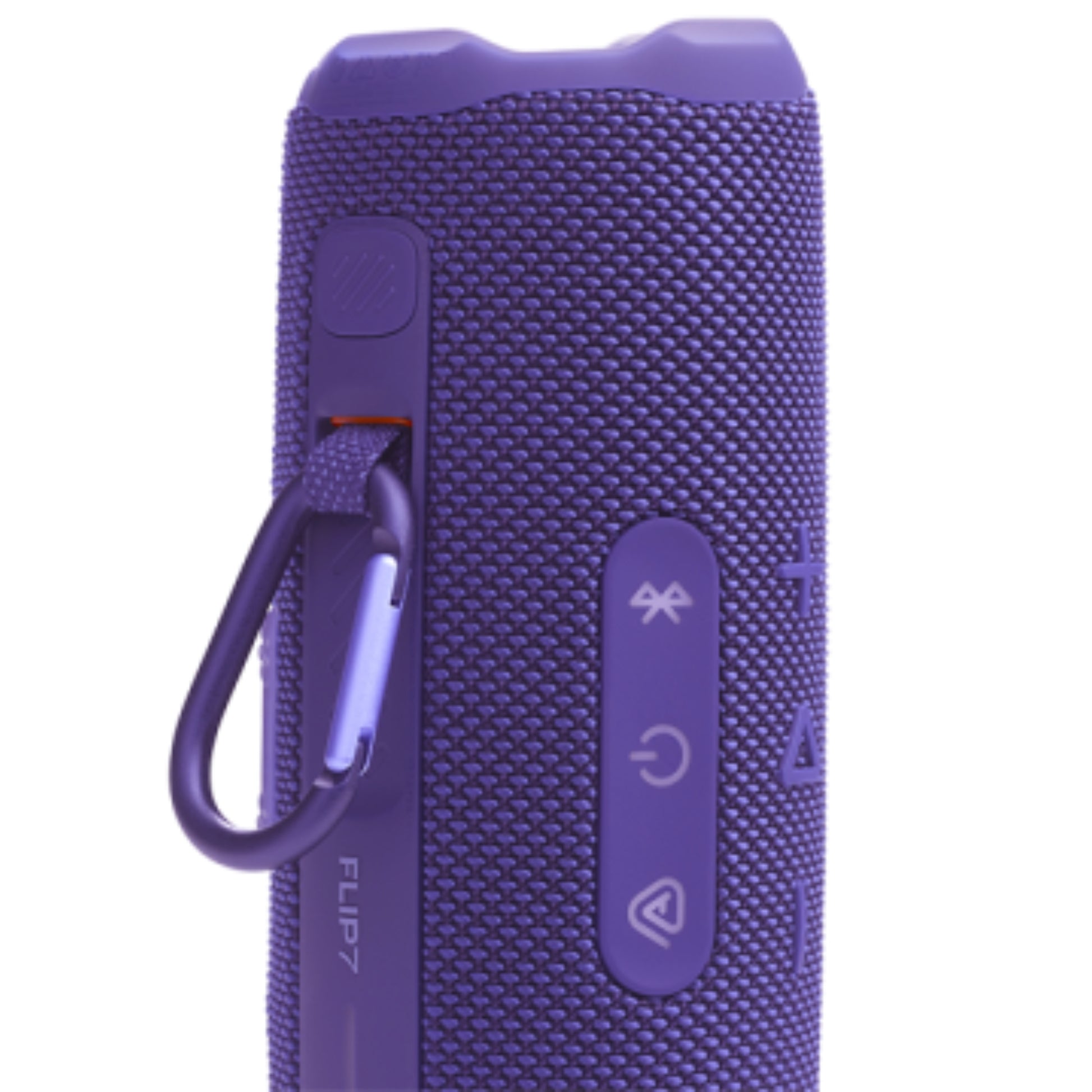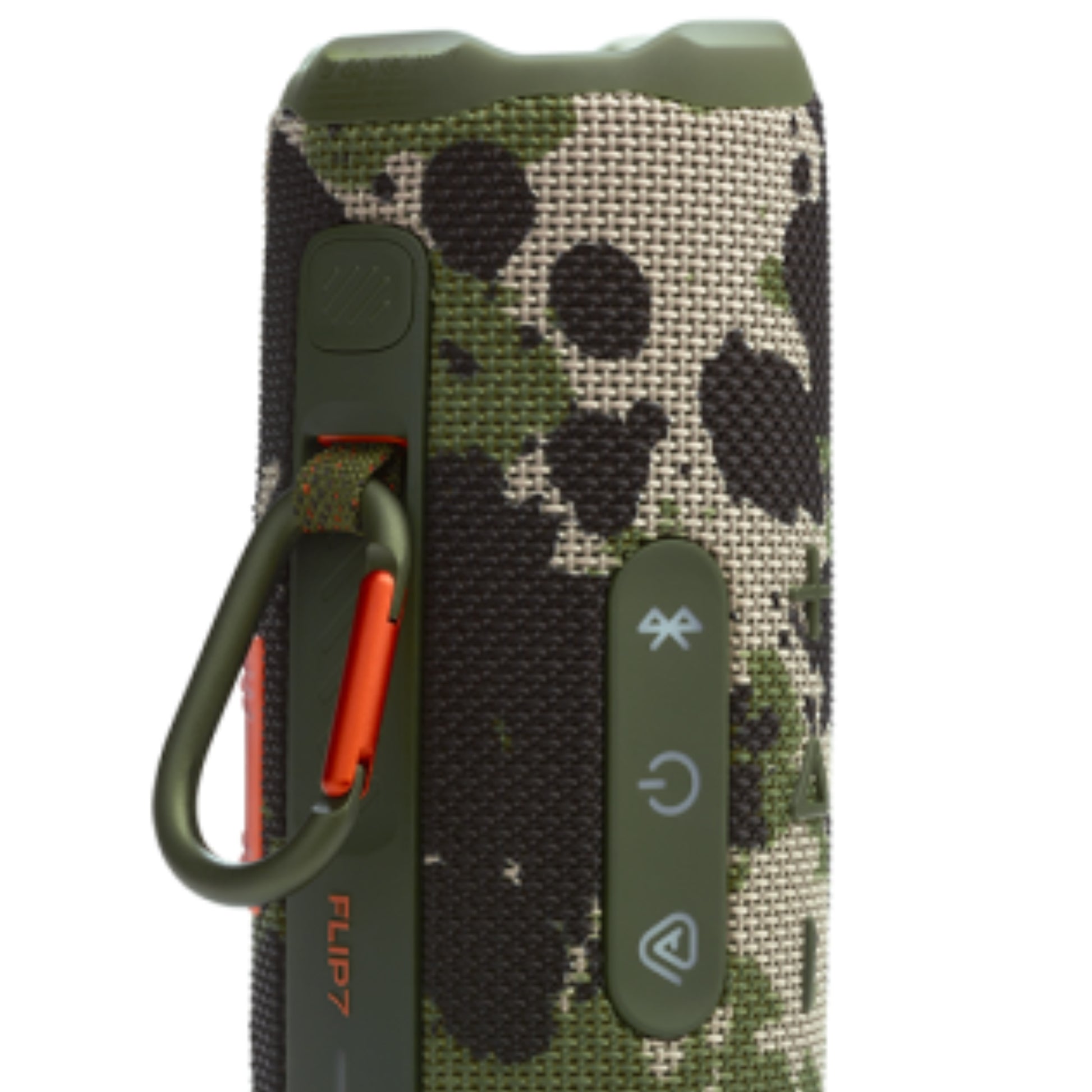 ה-JBL Flip 7 משלב פלסטיק ובד ממוחזר עבור לולאת הרמקול. הוא ארוז גם בנייר עם אישור FSC מודפס עם סויה דְיוֹ.